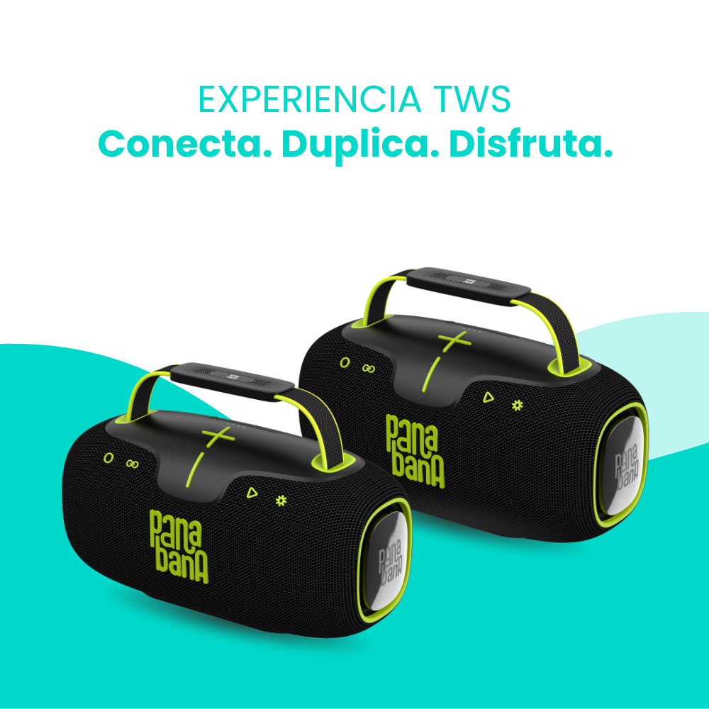 Con la función TWS (True Wireless Stereo) puedes emparejar dos parlantes Panabana del mismo modelo y duplicar la potencia para que suenen más fuerte o llevar la misma música a distintos espacios, ideal para cuando la fiesta se mueve entre ambientes.